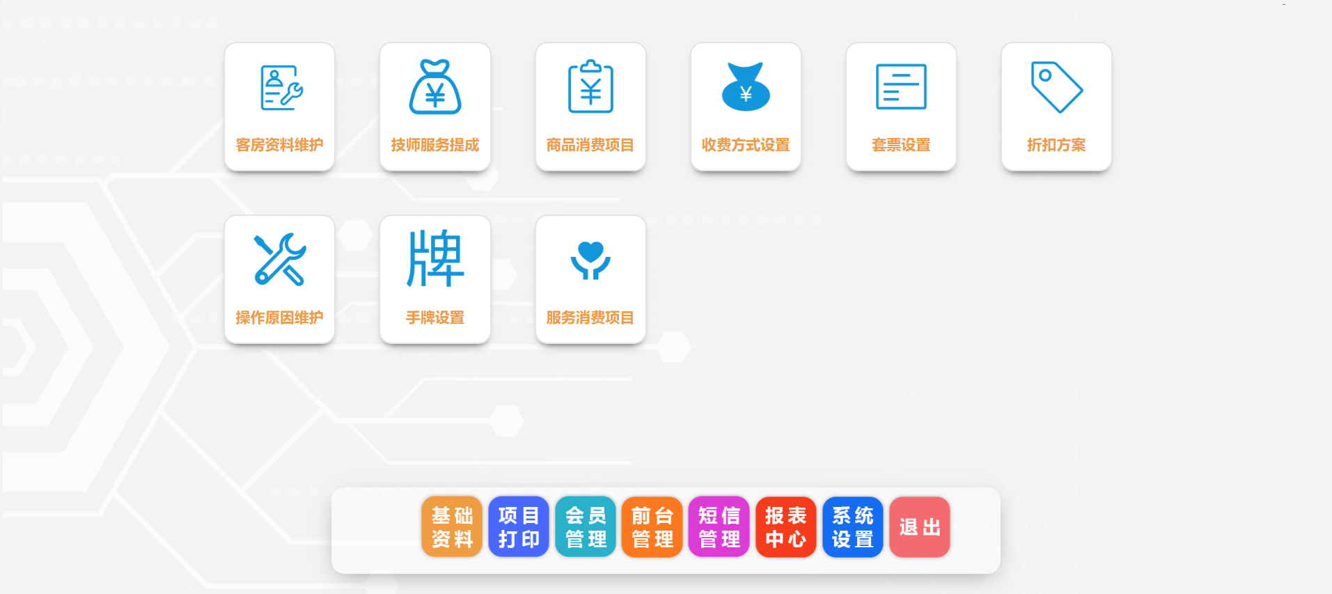 前臺管理系統可完成整個前臺營業的全過程。包括開單、消單、并單、加牌、減牌、結算 管理、技師管理、客房管理等。